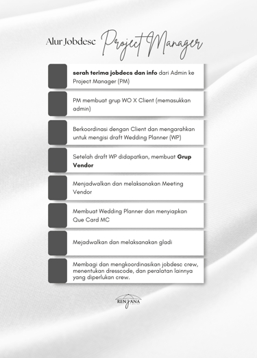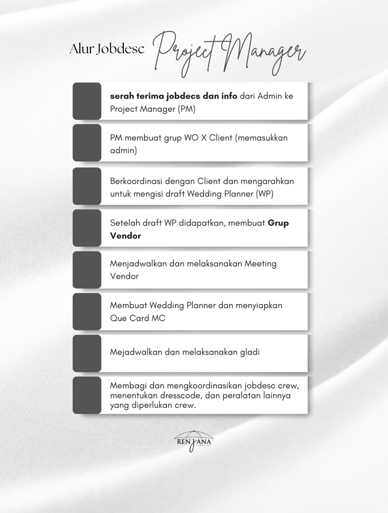 Membuat timeline dari awal hingga akhir acara, mulai dari pemilihan vendor, fitting pengantin, hingga hari H pernikahan.